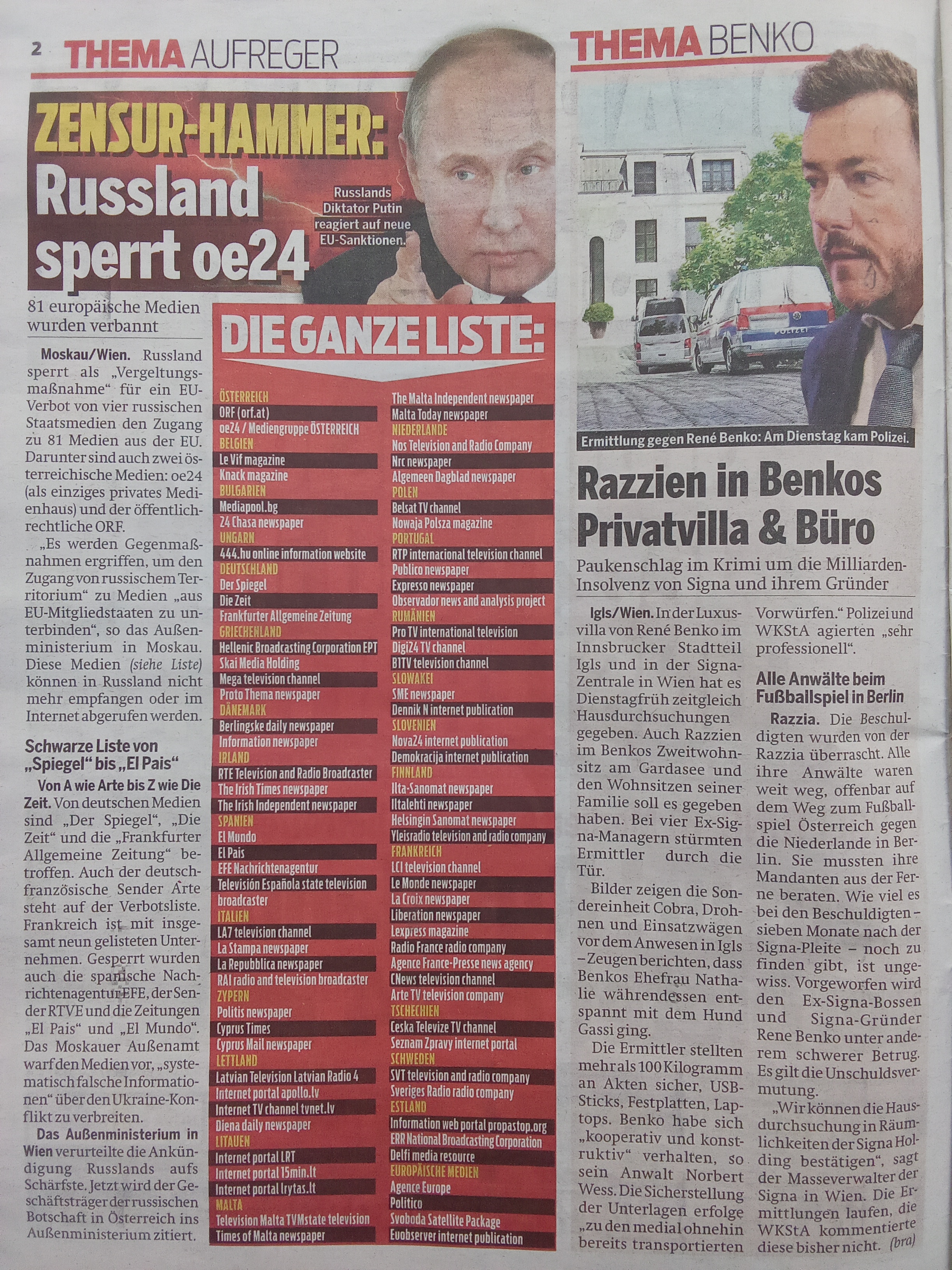Ebenfalls mehrfach liegen vor die Kronenzeitung und der Kurier, die am Donnerstag, dem Feiertag, erschienen sind und noch aushängen.